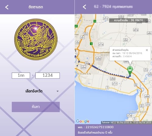 จากนั้นเปิดแอพ DLT GPS ขึ้นมา แล้วระบุหมายเลขทะเบียนของรถสาธารณะ ระบบก็จะแสดงพิกัดของรถทัวร์หรือรถบรรทุกคันนั้นๆ ว่าอยู่ตรงไหน …ใช้ความเร็วเท่าไหร่ … ซึ่งฟีเจอร์นี้ GPS ที่แสดงบนแอปฯ DLT GPS มีประโยขน์มากเช่น ทราบว่า คนที่รัก ที่ขึ้นรถทัวร์ไป ตอนนี้อยู่ที่ไหนแล้วนะ เดินทางปลอดภัยหรือเปล่า ก็แค่ใส่หมายเลขทะเบียนรถคันนั้นบนแอพ ก็ทราบทันทีว่ารถโดยสารคันนั้นถึงจุดไหนแล้ว เกิดอุบัติเหตุอะไรหรือไม่ คนขับขับเร็วเกินกำหนดหรือป่าว รวมถึงทราบชื่อคนขับรถคันนั้นด้วย